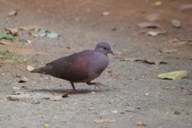 L'adulte a la tête, le menton et la gorge gris-bleu, la nuque grise teintée de mauve, l'avant du cou lie-de-vin, l'arrière et les côtés de celui-ci gris-mauve marqués de taches noirâtres à la base des plumes et de petites taches métalliques mauve vif. Les parties supérieures du corps sont brun-mauve à l'exception du dos et des sus-caudales gris-brun tandis que les inférieures sont lie-de-vin soutenu à l'exception du ventre plus pâle et des sous-caudales blanches. Le dessus des ailes est brun roux à l'exception des rémiges brunes finement bordées de roux sur les marges externes tandis que le dessous est uniformément brun. Les rectrices sont entièrement brun-gris à l'exception des externes noirâtres à extrémité blanche. Le bec est rouge à la base et gris à l'extrémité. Les iris sont bruns au centre et cerclés de rouge, couleur retrouvée au niveau des cercles orbitaux. Les tarses et les doigts sont rougeâtres.