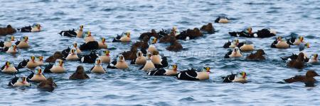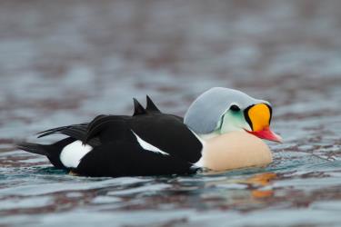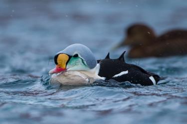 S'il est légèrement plus petit que l'Eider à duvet, l'Eider royal ou à tête grise surpasse son cousin en termes de plumage. Avec sa grande tête anguleuse teintée de bleu ciel, de vert et de jaune vif, le mâle est un magnifique canard marin. En revanche, la femelle est marbrée et mouchetée de brun comme sa cousine.