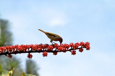 Il se nourrit de la strate arbustive jusqu'à la canopée, se déplaçant de branche en branche à la recherche de fleurs dont il prend le nectar et le pollen. Il se nourrit aussi d'insectes et d'araignées qu'il cherche parmi les feuilles ou effectue des vols courts pour les attraper. Il plane parfois devant des fleurs ou des toiles d'araignée en quête de nourriture.