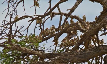 C'est un oiseau principalement granivore, mais aussi insectivore et herbivore. Il chasse en groupe et cause d'énormes dégâts aux cultures africaines, ce qui lui vaut d'être souvent comparé aux criquets. Il ravage plantations de blé, d'avoine, de mil, de sorgho et de riz.