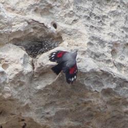 Malgré les taches colorées des ailes, l'oiseau est majoritairement gris et son plumage lui offre une bonne homochromie le rendant difficile à repérer dans son milieu rupestre.