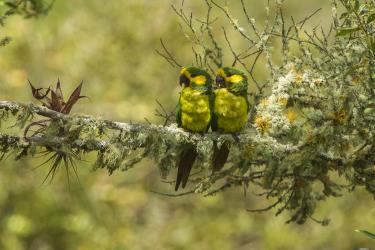 La conure à joues d'or peuple les Andes de la Colombie et du nord de l'Équateur où elle est en danger à cause de la destruction de son habitat.