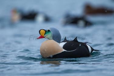 S'il est légèrement plus petit que l'Eider à duvet, l'Eider royal ou à tête grise surpasse son cousin en termes de plumage. Avec sa grande tête anguleuse teintée de bleu ciel, de vert et de jaune vif, le mâle est un magnifique canard marin. En revanche, la femelle est marbrée et mouchetée de brun comme sa cousine.