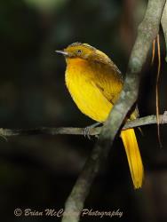 Le premier spécimen découvert était une femelle ou un juvénile, donc en plumage gris olive, que le naturaliste Kendall Broadbent collecta en 1882 près de la source de la rivière Tully dans le nord-est du Queensland. Quand De Vis, 1883, nomma le genre et l’espèce, il ne connaissait pas encore l’existence du mâle et ce n’est qu’en que le premier spécimen mâle fut collecté, en l’occurrence par Archibald Meston sur le mont Bellender Ker près de Cairns. Cet oiseau était si brillamment coloré de jaune d’or et apparut tellement différent du sujet gris olive que De Vis crut qu’il s’agissait d’une autre espèce et même d’un autre genre. La découverte de Meston incita d’autres explorateurs à rechercher l’oiseau doré sur la même montagne. Le même Broadbent, le découvreur du premier spécimen, collecta une série de mâles et de femelles, et trouva même plusieurs berceaux (Ottaviani 2014).