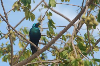 Le Choucador à oreillons bleus (Lamprotornis chalybaeus), aussi appelé Merle bronzé vert, Étourneau métallique commun, Merle métallique à oreillons bleus ou Merle métallique commun, est une espèce de passereaux de la famille des Sturnidae.