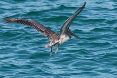 Avec leurs larges ailes et leur long bec, les pélicans bruns sont balourds à terre, toutefois les plus grands pélécaniformes sont d'une rare élégance dans les airs et d'une efficacité redoutable lorsqu'ils plongent pour pêcher dans les mers qui bordent le continent américain. Leur sac à provision extensible se teinte de rouge et vert au moment de la parade amoureuse.